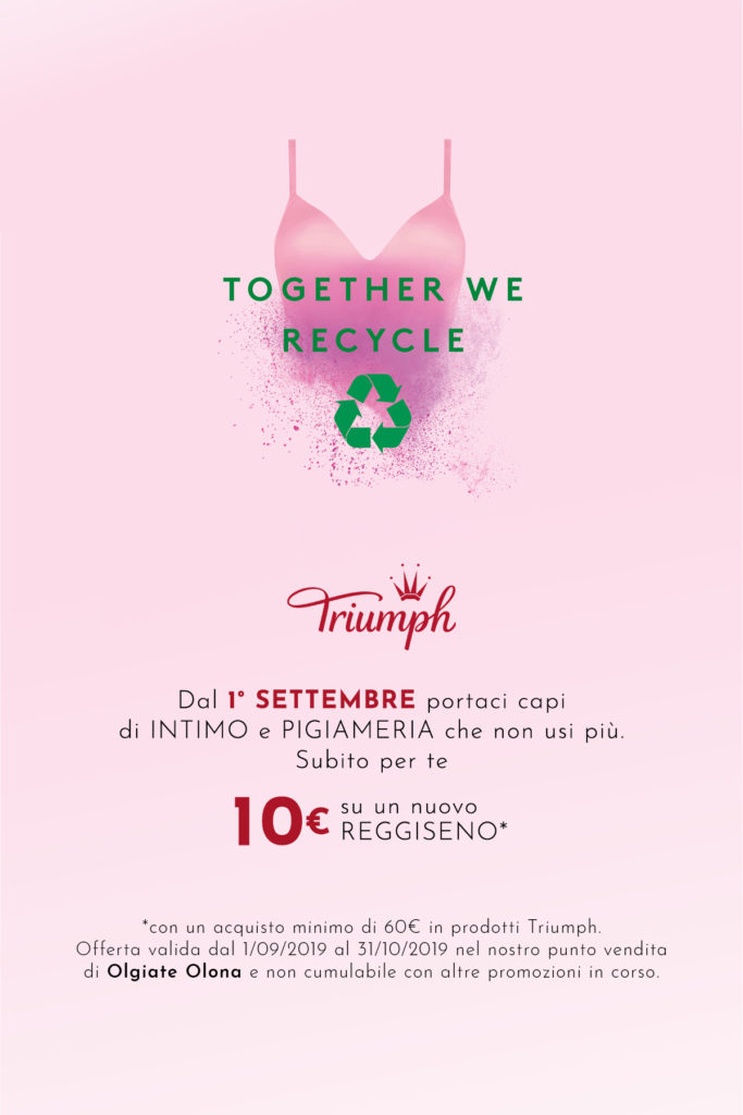 Da settembre potrai portare in negozio capi di abbigliamento intimo e pigiameria che non usi più e Triumph, con l’aiuto del suo partner di riciclaggio, darà loro una nuova vita riutilizzandoli – ovvero reintroducendo gli articoli ancora indossabili in circuiti di beni di seconda mano – oppure riciclandoli, ovvero trasformandoli ad esempio in materiale isolante per l’industria dell’automobile.